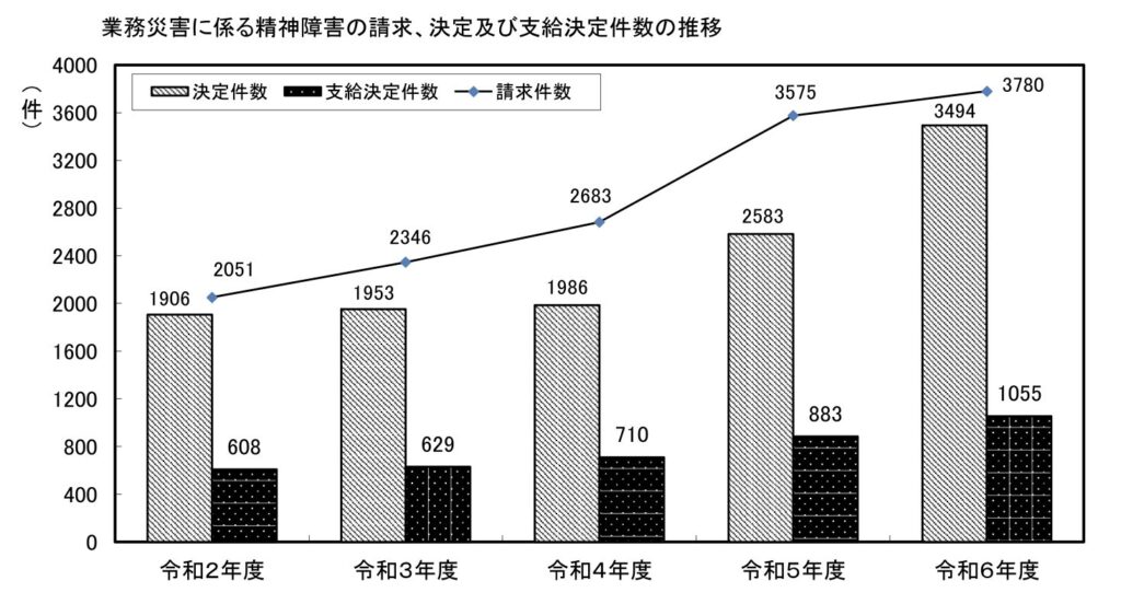 令和6年度厚生労働省のデータによると、精神障害(いわゆるメンタル疾患)の労災支給決定件数は1,055件に達し、過去最多を更新しました。